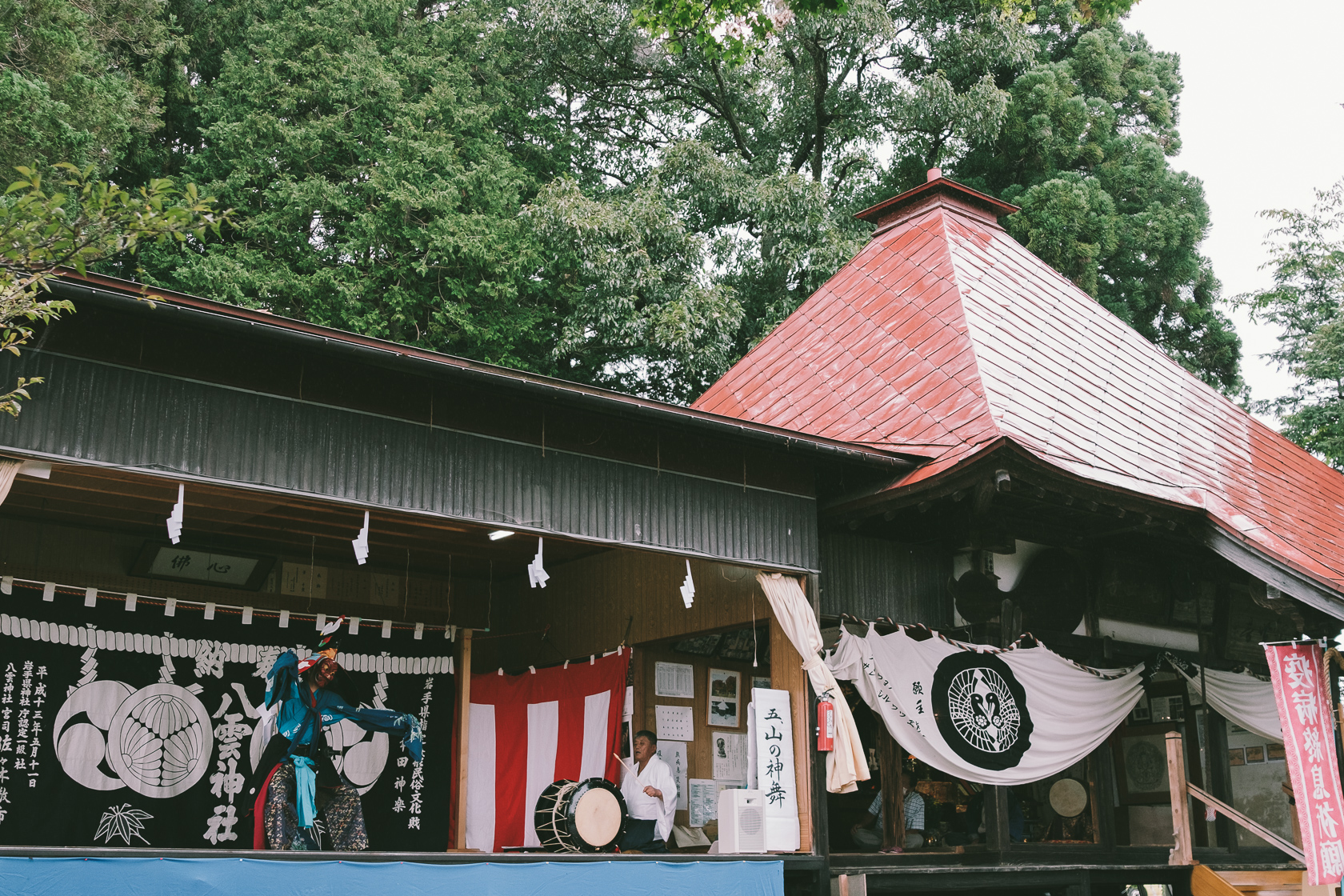 花巻で糠塚鹿子踊を拝見した後、午後は紫波町の嶋の堂観音で幸田神楽の奉納があるというので向かいました。到着した頃にはすでに2番の翁舞の最中でした。