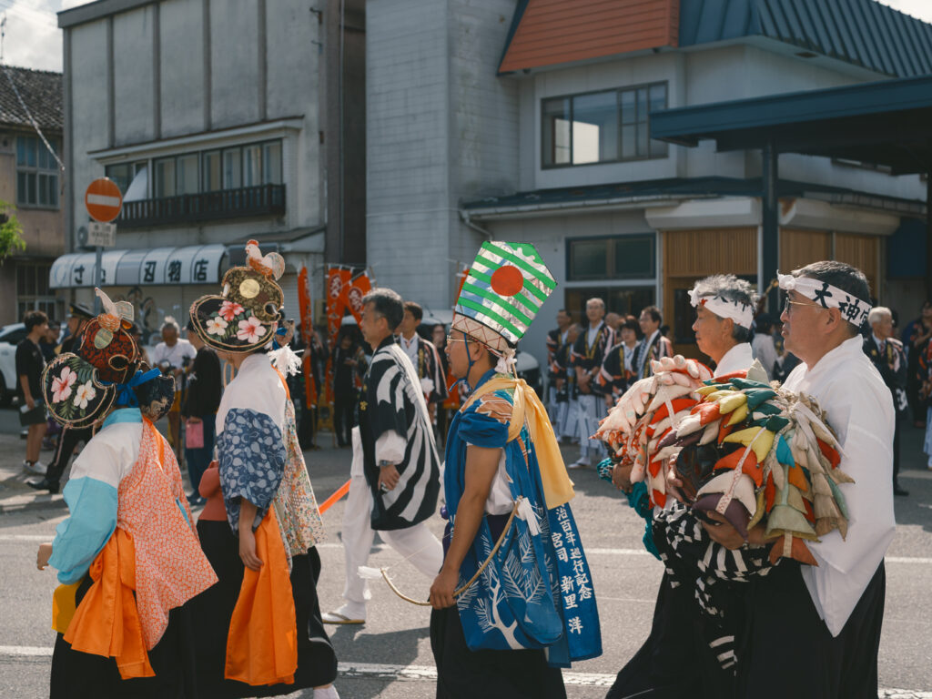 神社での奉納が終わった後は、各芸能団体が町内を門付けして回っていました。